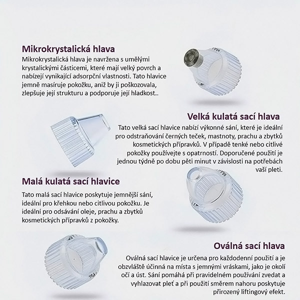 Přístroj je dodáván se 4 vyměnitelnými nástavci, z nichž každý je navržen tak, aby se zaměřil na konkrétní problémy pleti. Podrobnější informace o tom, jak jednotlivé nástavce fungují, najdete v grafice níže!